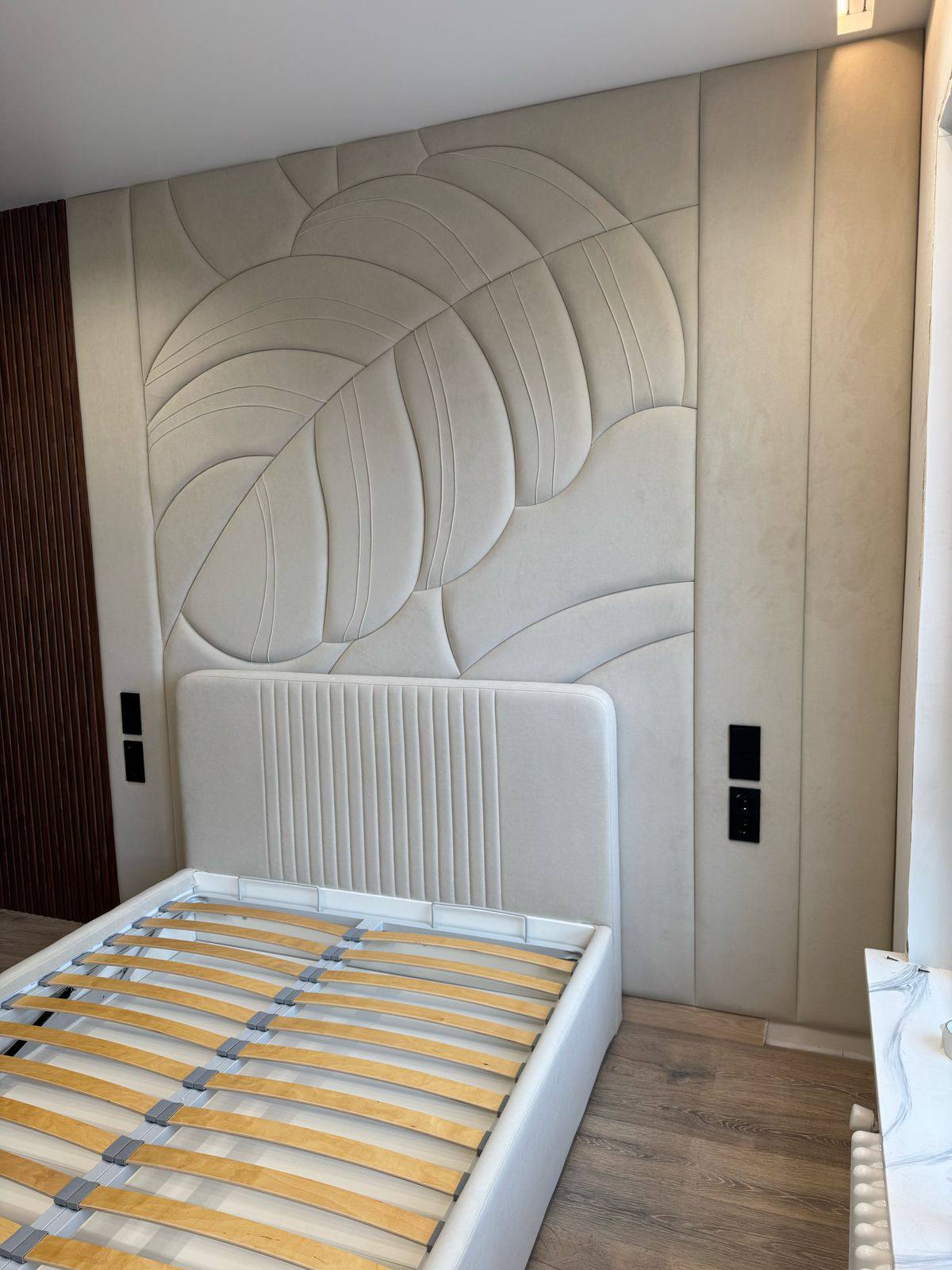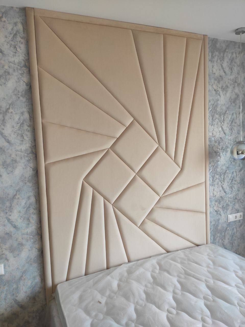 Панель выполняется из нескольких слоёв: основание из фанеры или МДФ, затем идёт слой пенополиуретана, и верхней частью становится искусственная или натуральная кожа. Технология отработана — получится аккуратный и роскошный результат.